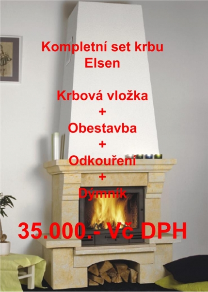 Akční kompletní set obsahuje 1x krbovou stavebnici Elsen v čelním nebo rohovém provedení, 1x krbovou vložku Zeus 53, 1x komínovou klapku, 1x 3segmentové koleno, 2x rouru 500mm, 1x kličku na klapku, 2x mřížku u čelního provedení nebo 1x mřížku u rohového provedení, 1x kamnářský tmel, 1x kamnářské lepidlo, 1x spárovací směs, prvky na sopouch (izolační desky, omítku, rohové lišty, perlinku a lepidlo pod perlinku), čistič skla a paletu s balícím materiálem.