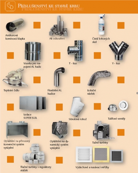 Materiály pro stavby sopouchů, tmely, lepidla, spárovací hmoty, odkouření, redukce, výdechové mřížky, příslušenství pro rozvod vzduchu - ventiátory, teplotní čidla, tlačné i tažné turbíny, flexibilní hadice, izolační návleky, talířové ventily atd.